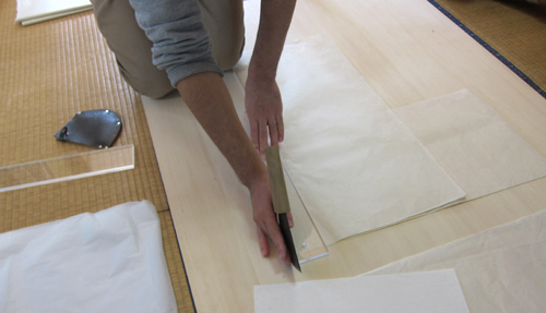 Smoothing wavy papers: the slightly damped paper is brushed onto a window, with